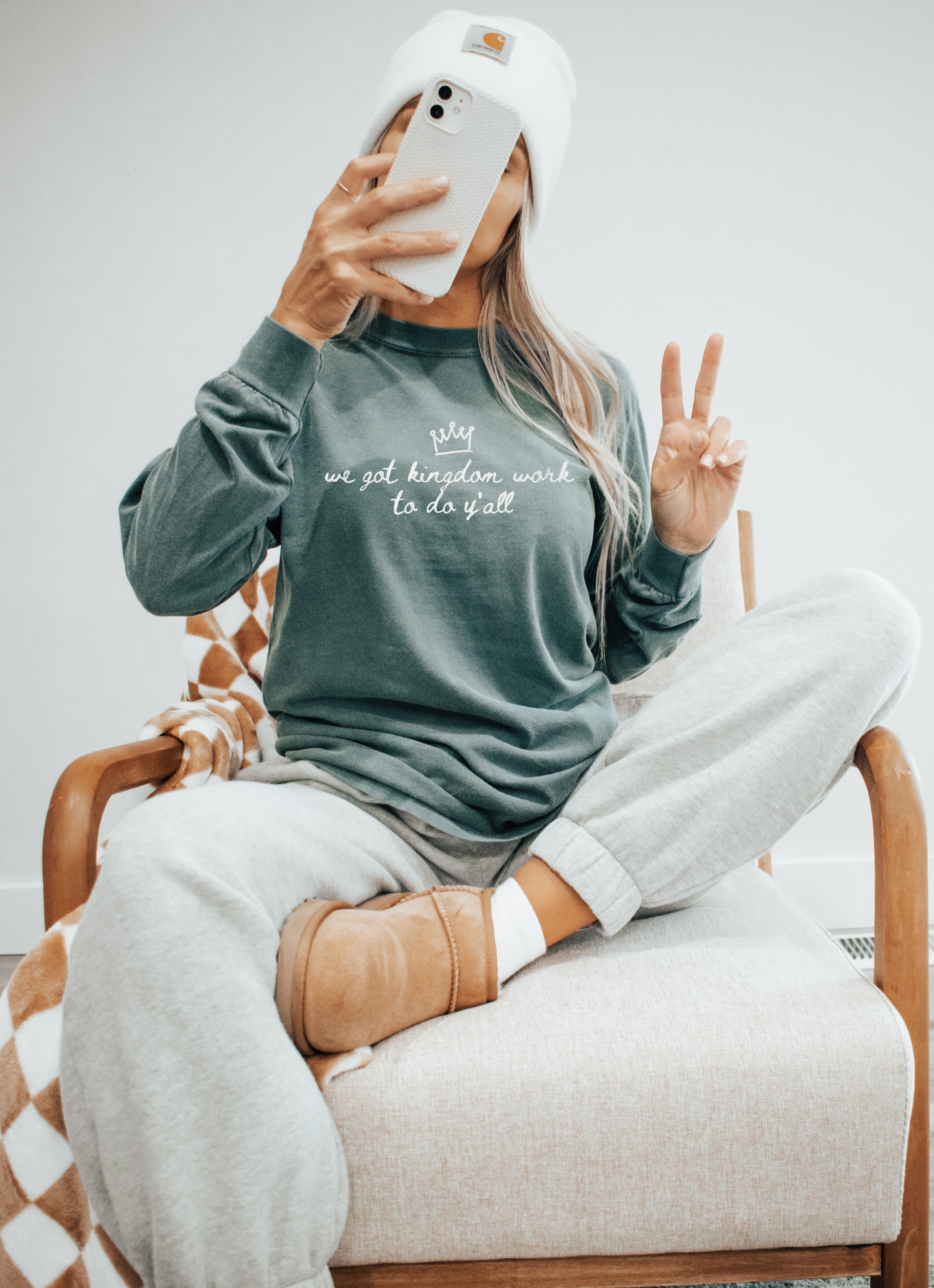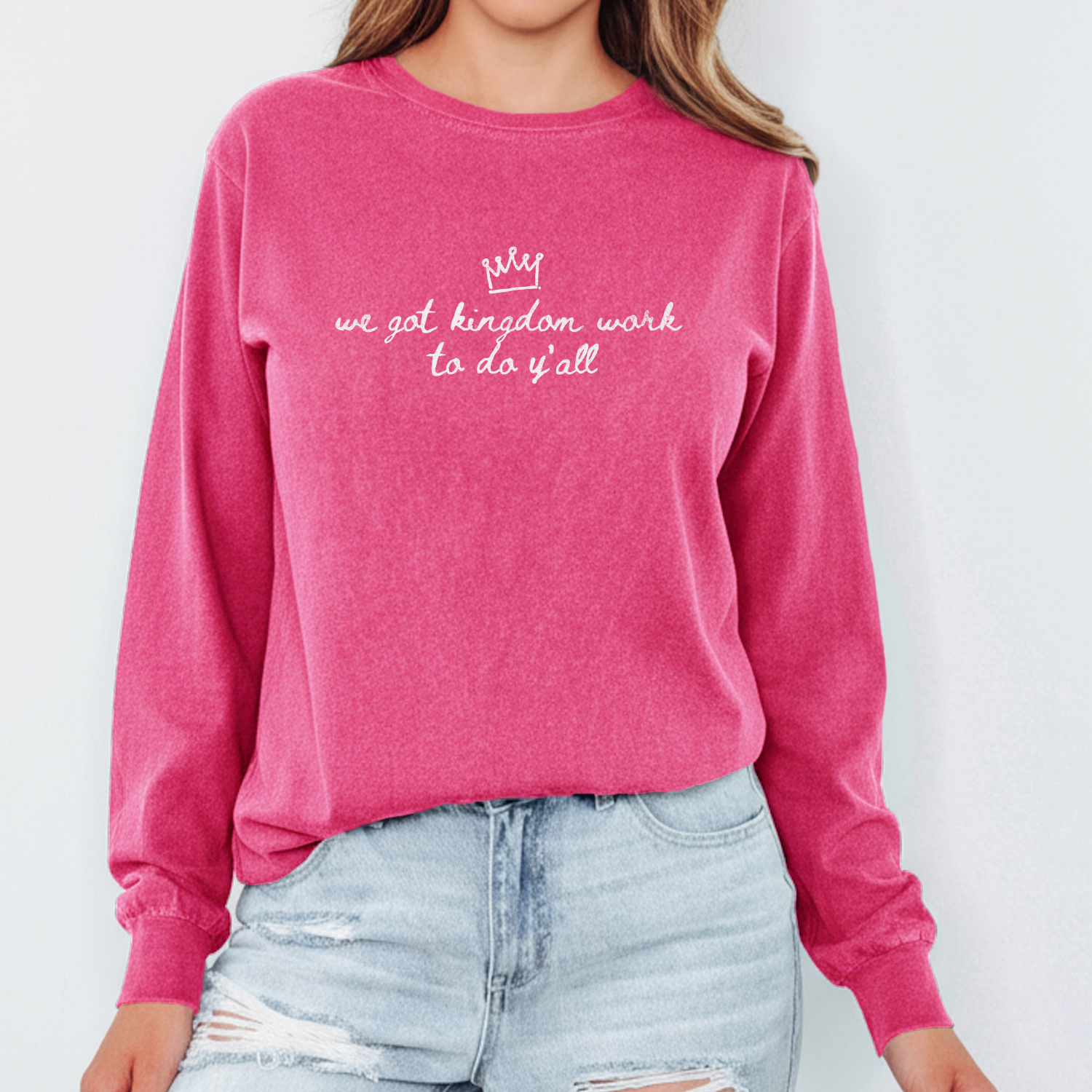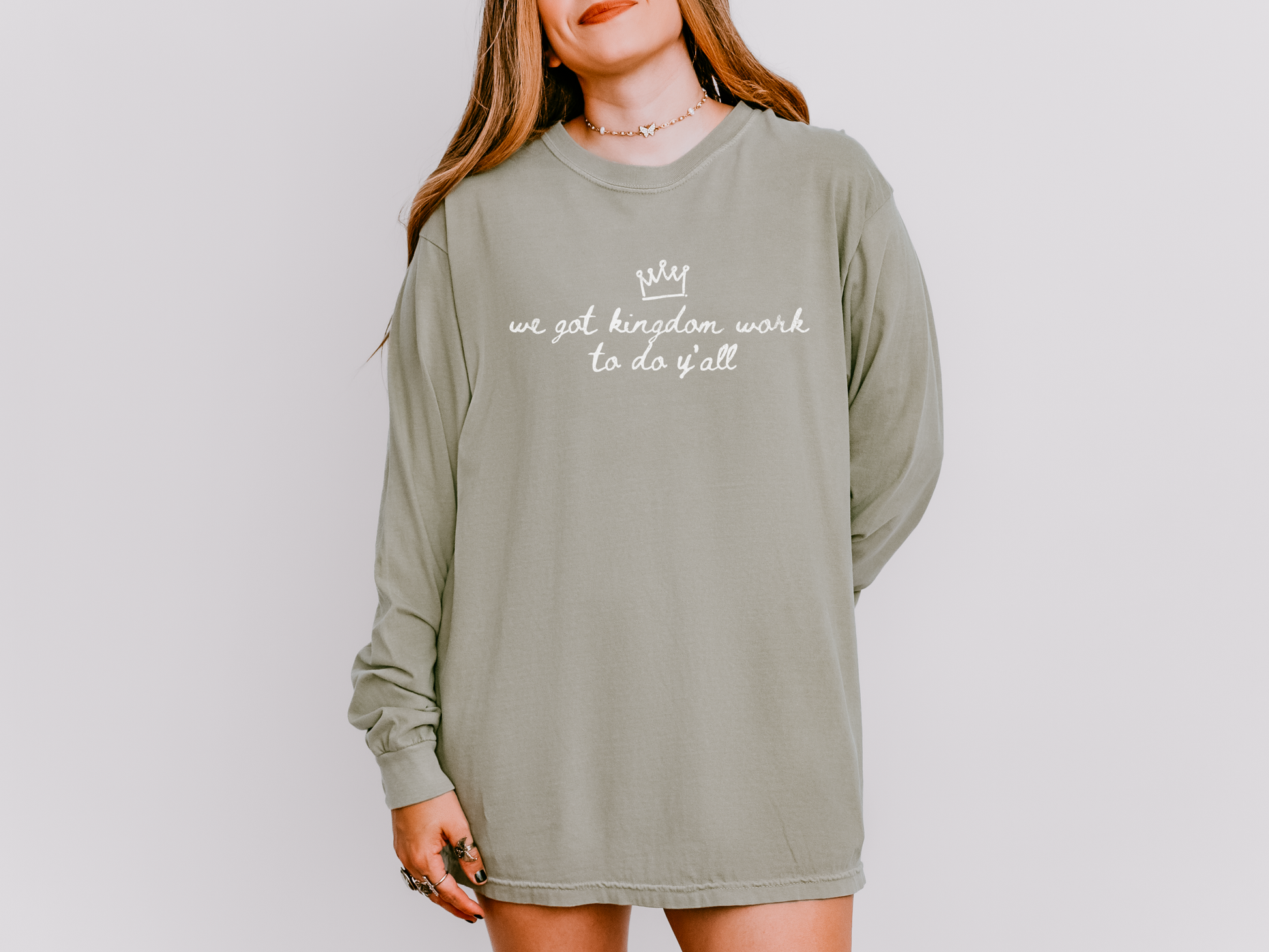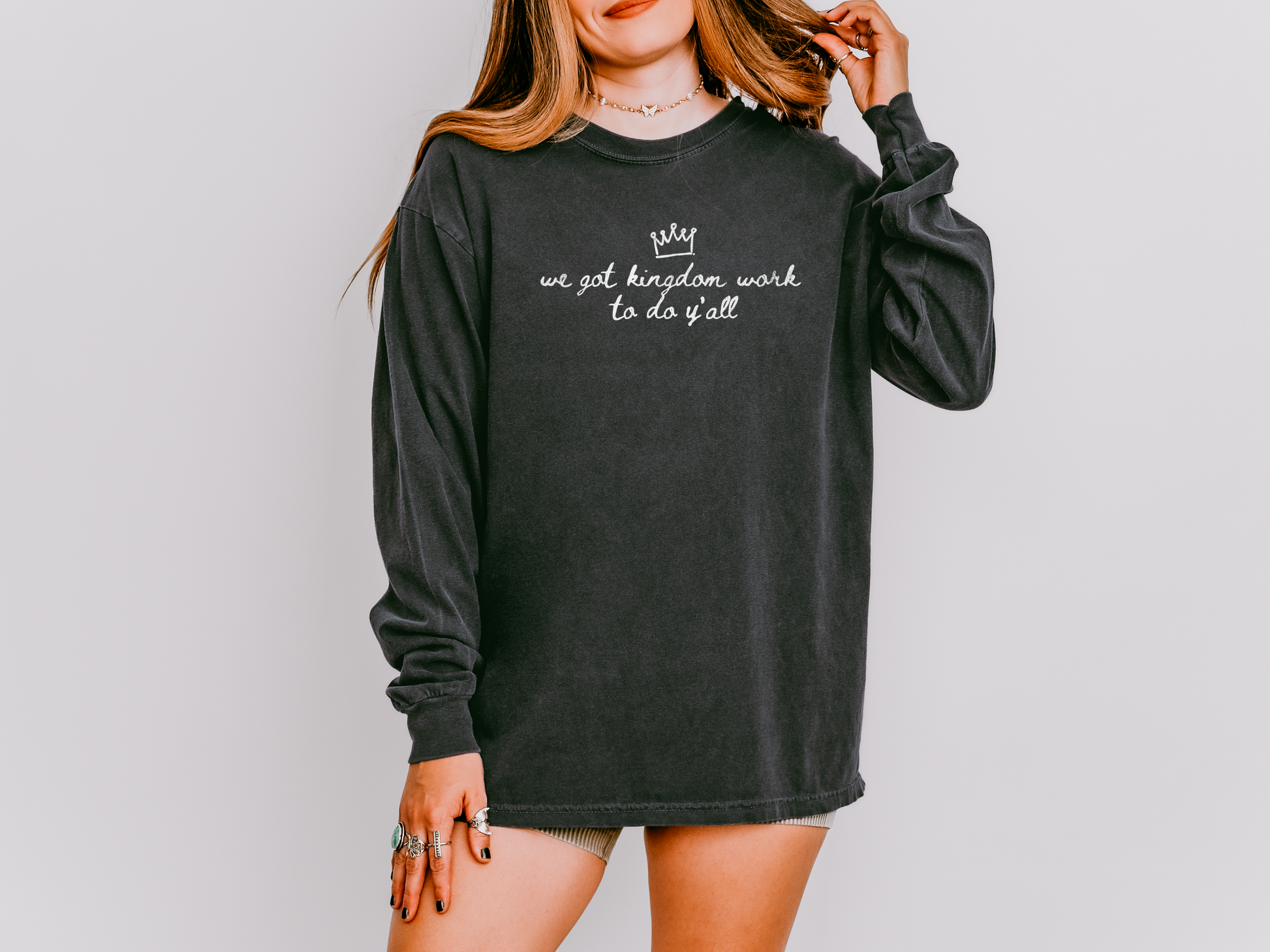Hey Momma - you’re busy, you’re bold, and you’ve got real Kingdom work to do. That’s why this tee was made for you. Soft, roomy, and built for the everyday hustle, our “We Got Kingdom Work To Do Y’all” long-sleeve is like your favorite go-to layer but with a message. This shirt holds up for hands-on days and looks effortlessly cool under a jacket when the temps drop. Because yes - you can chase your purpose and look cute doing it.