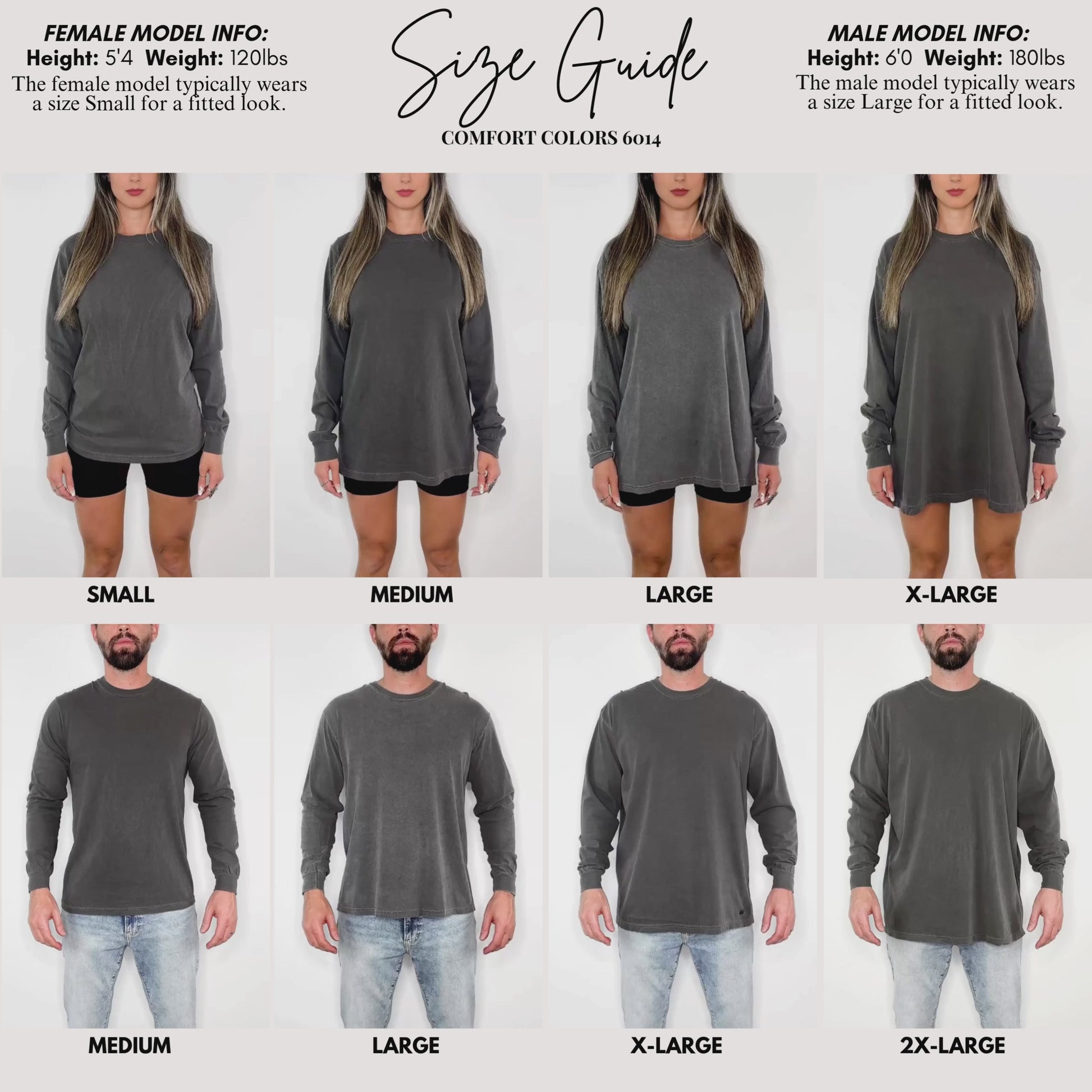 This is a classic-fit long sleeve tee; if you prefer an oversized look, consider sizing up. True-to-size otherwise. Available in sizes S–3XL across a range of soft, muted tones (Black, Blue Jean, Graphite, Sandstone, etc.).